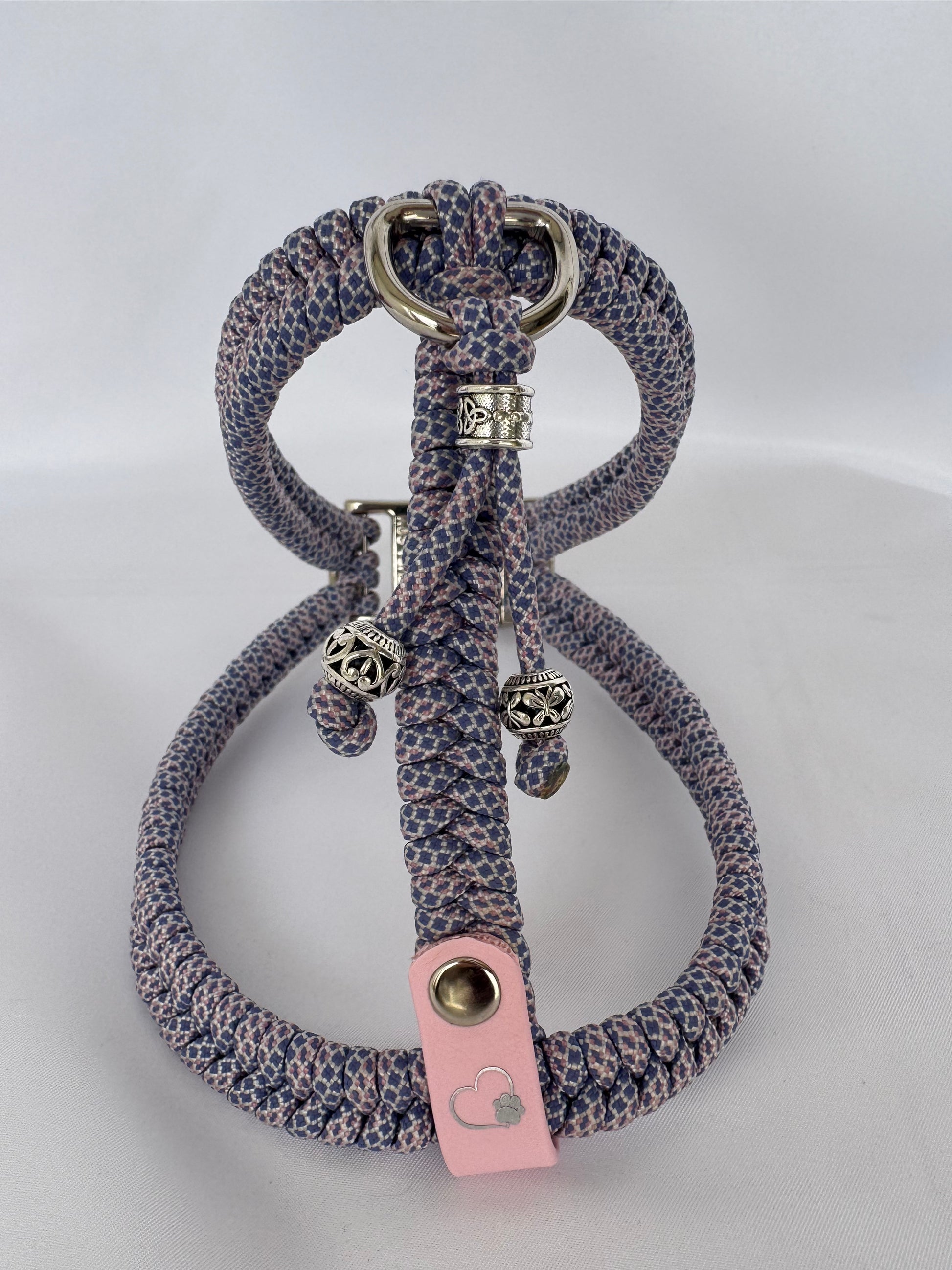 Nuestro arnés hecho a mano con diamond paracord y accesorios de níquel y acero inoxidable es un producto de alta calidad diseñado para ofrecer comodidad y seguridad a tu mascota. Además de un estilo único y elegante.