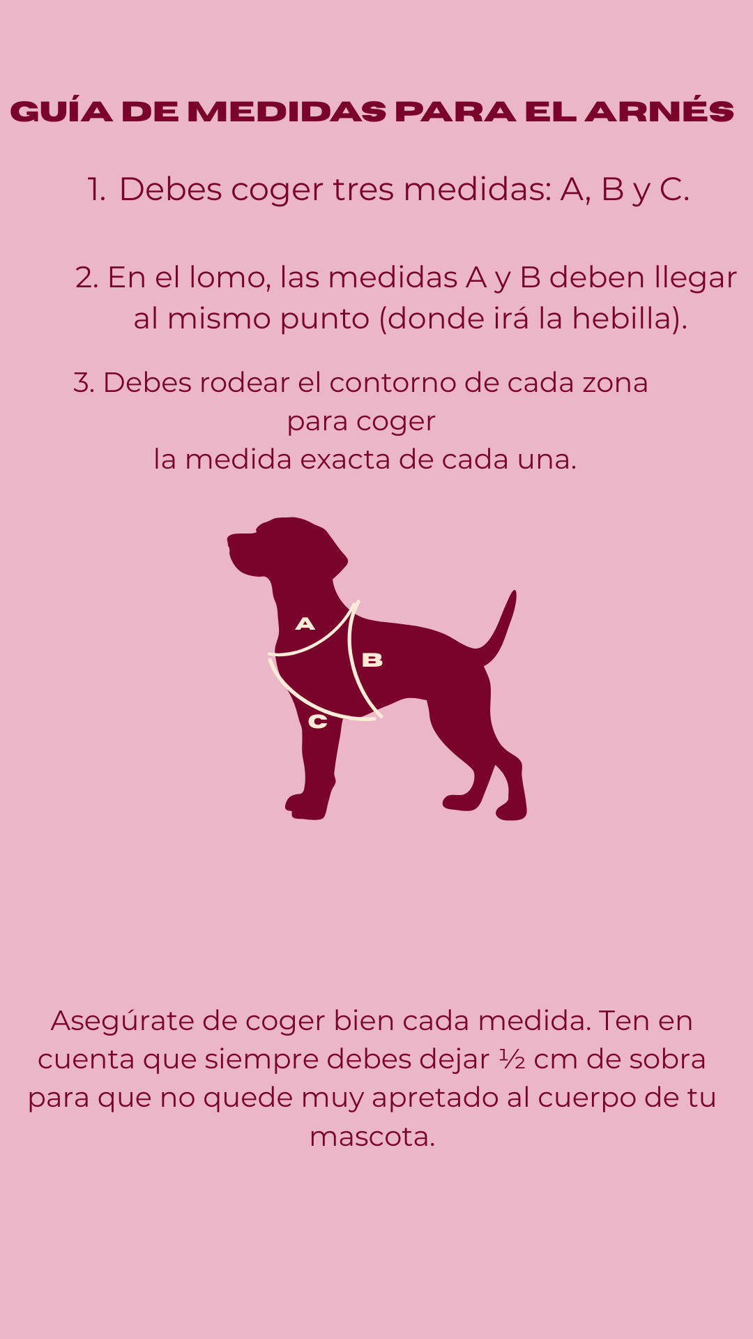 Es fundamental que proporciones las medidas exactas de tu mascota para asegurarnos de que el arnés se ajuste perfectamente, puesto que, debido a la naturaleza personalizada de este producto, no se aceptan cambios ni devoluciones una vez realizado el pedido. Por favor, asegúrate de proporcionar todos los datos correctos antes de completar tu pedido.
