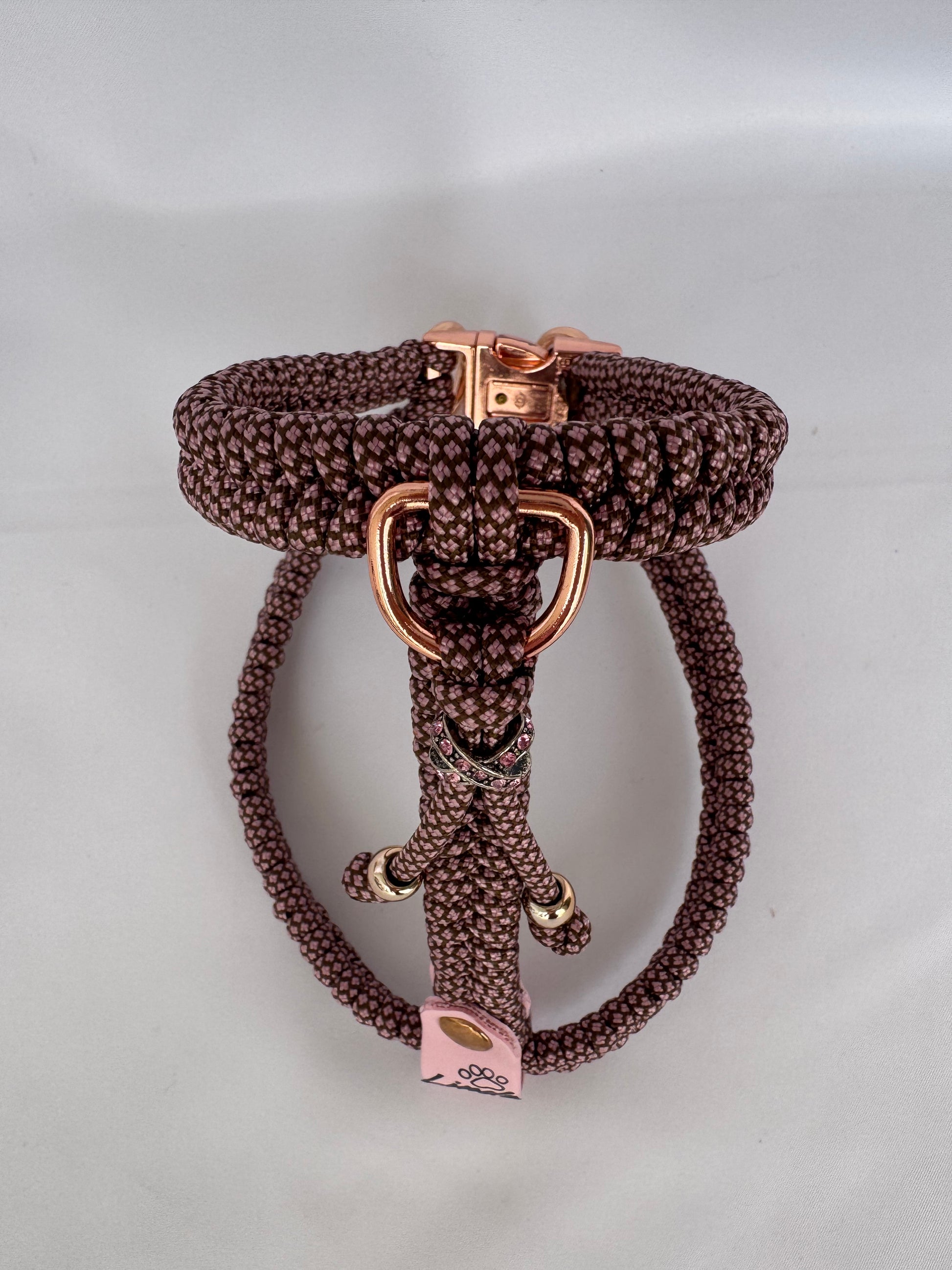 Nuestro arnés hecho a mano con diamond paracord y accesorios de níquel y acero inoxidable es un producto de alta calidad diseñado para ofrecer comodidad y seguridad a tu mascota. Además de un estilo único y elegante.