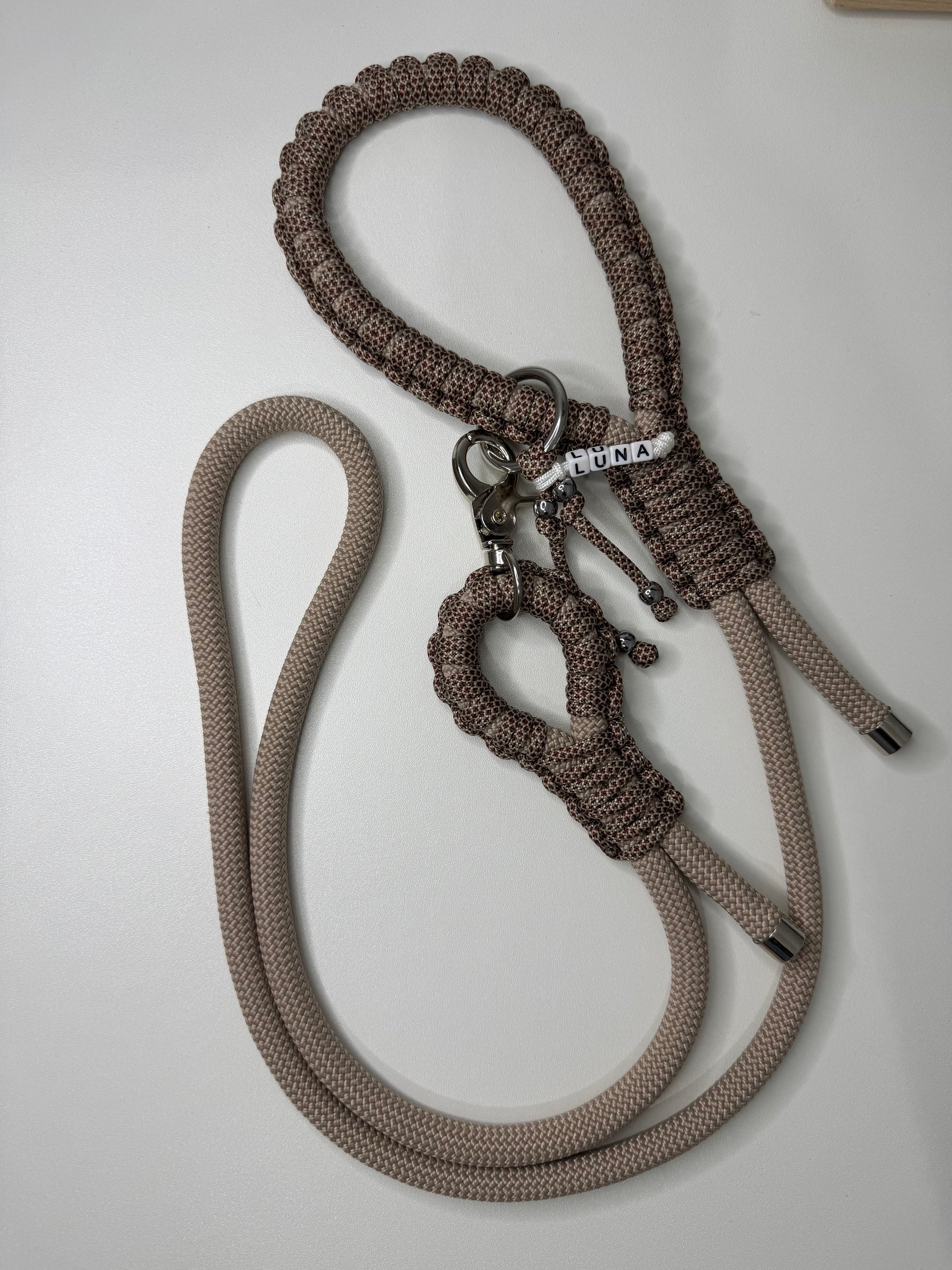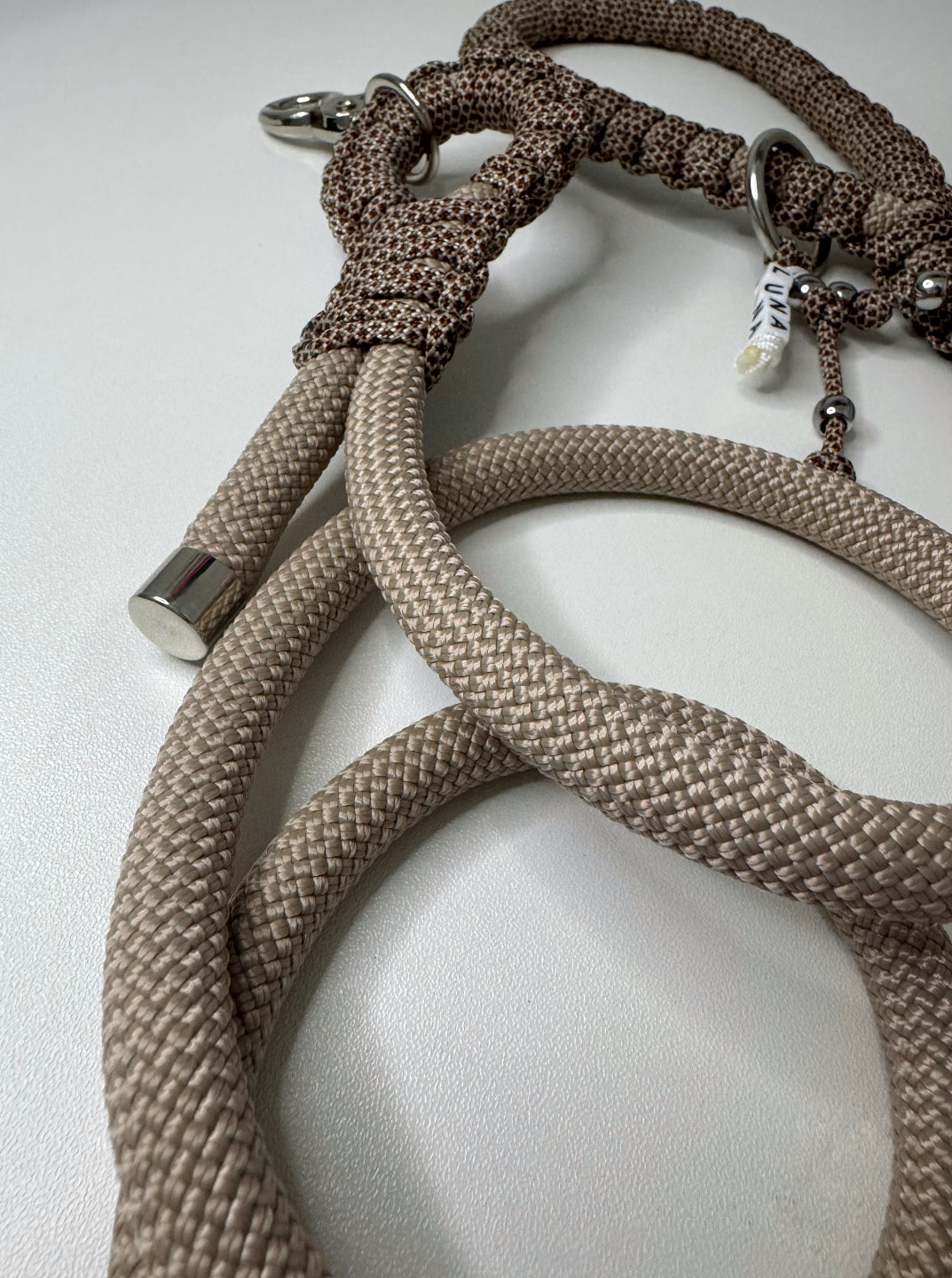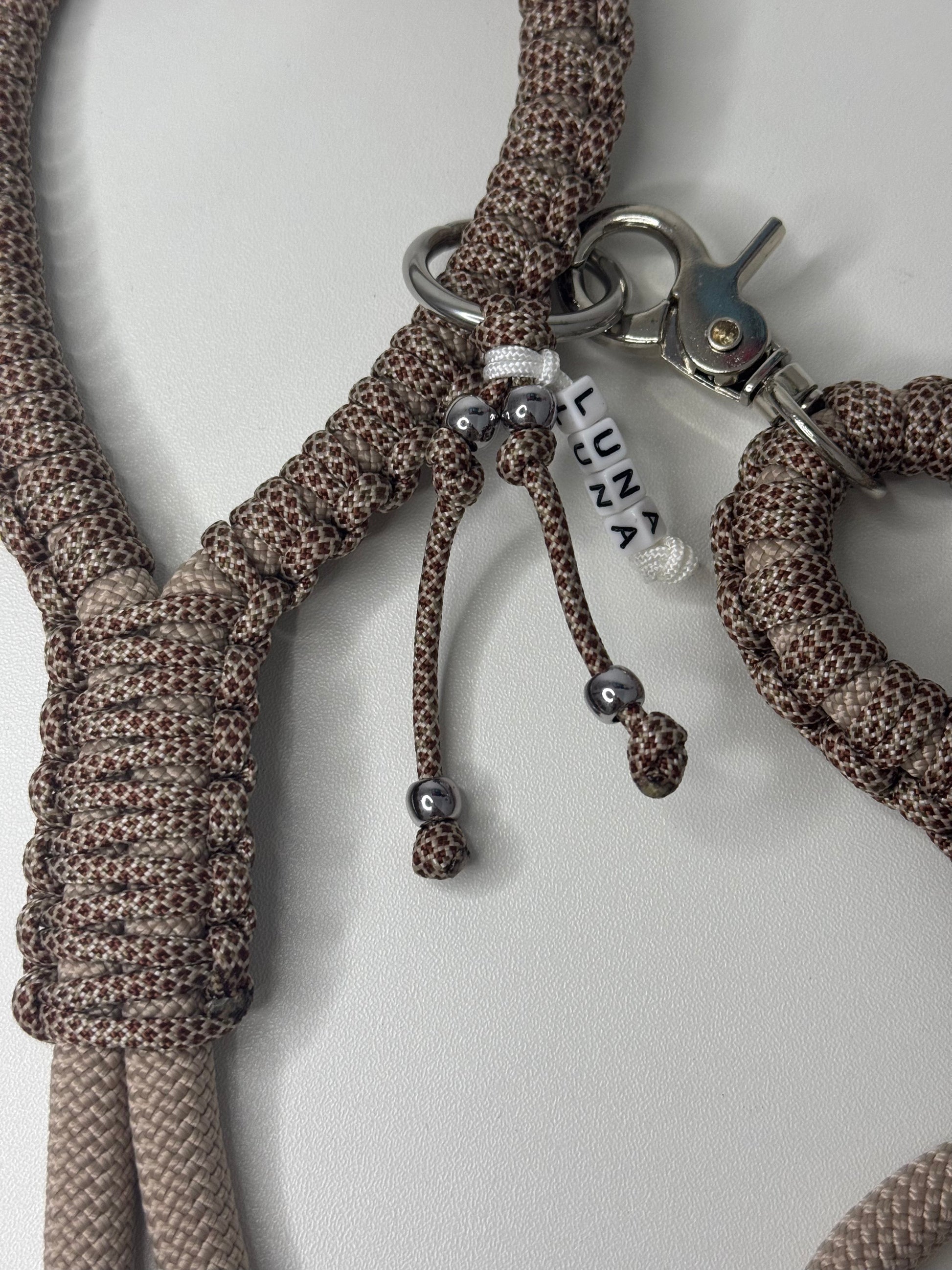 Material de los accesorios: mosquetón (aleación de zinc - niquelado), anilla (acero inoxidable) y tapas de extremo (latón – acabado niquelado)
