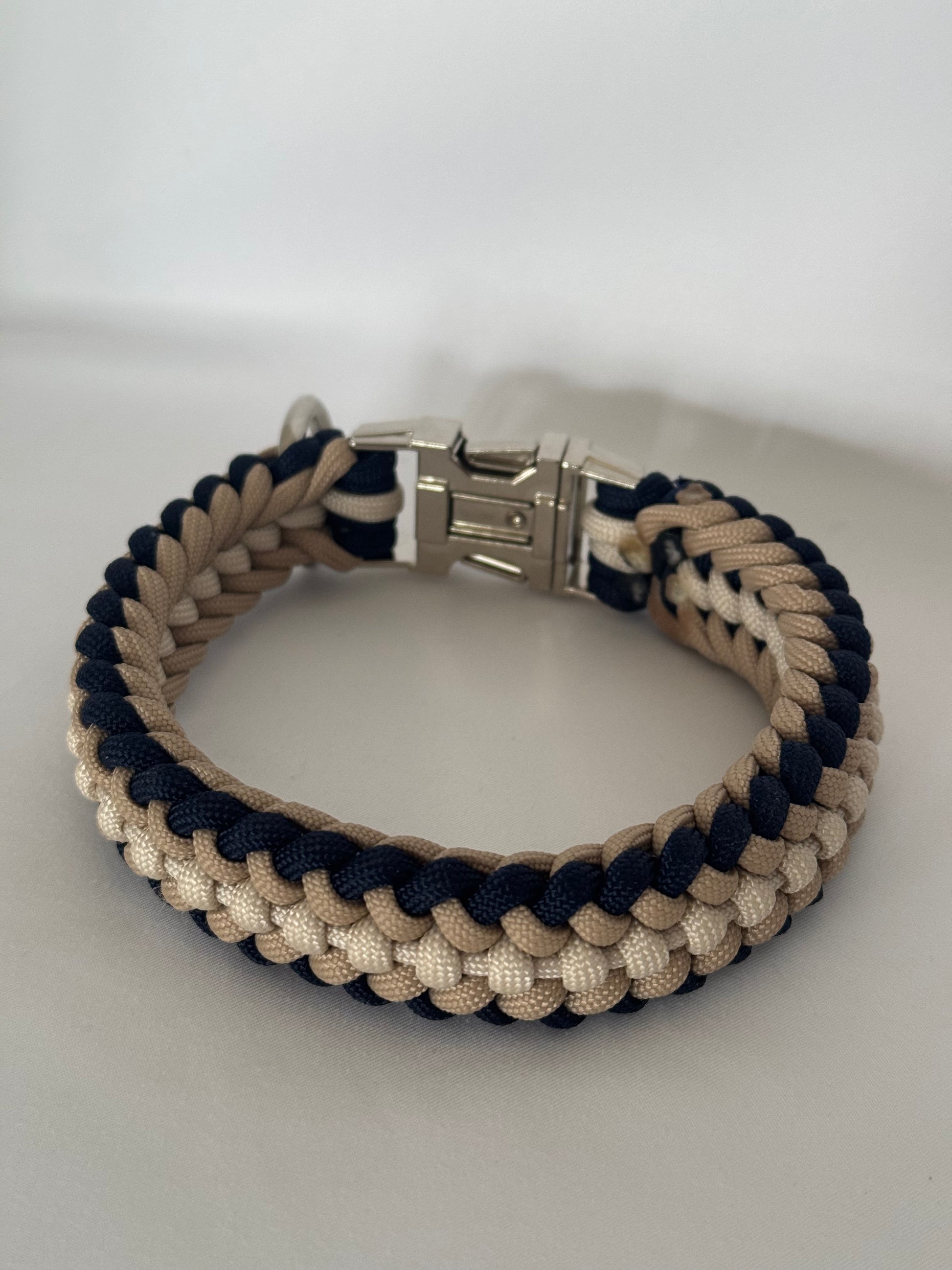 Este collar de Paracord es una pieza segura, cómoda y resistente, perfecta para aventureros y amantes del aire libre. Confeccionado con Paracord de alta calidad, te asegura una carga de rotura mínima de 250 kg por cada cuerda anudada.